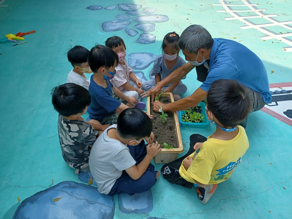 邀請逸芯爺爺種植達人和子瑈奶奶、子芯阿嬤一起來教孩子種菜,事先準備菜苗和種子,以及挖土、澆水…等工具,大家拿著鏟子、盆栽器皿前往菜園挖土,開始栽種→澆水→灑肥料。有三位爺奶的參與,活動進行很順利!
