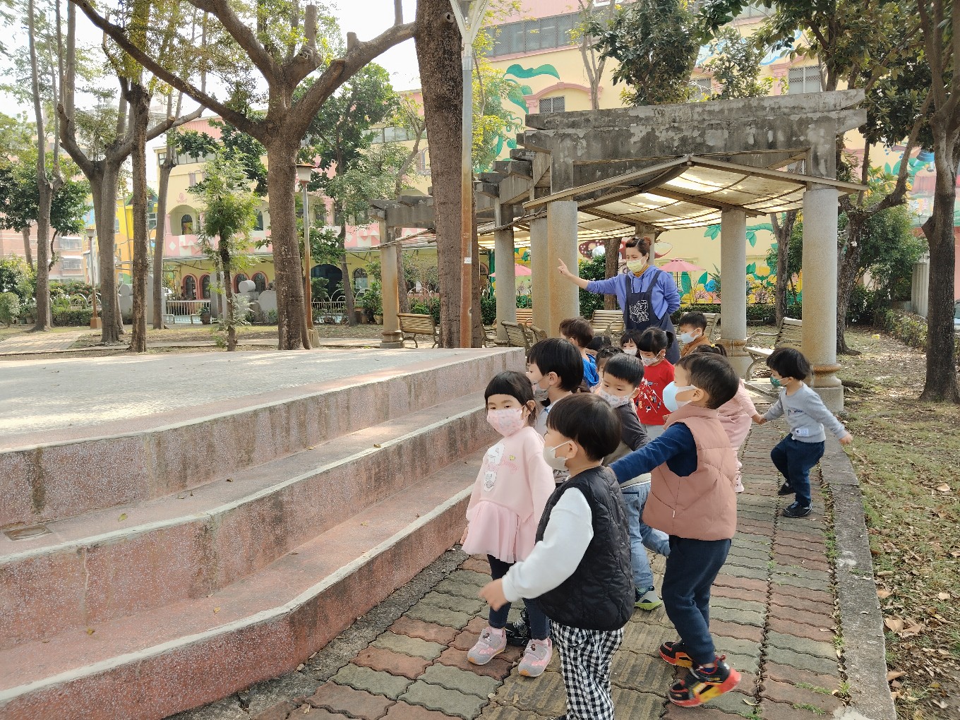 跟著老師的腳步一起來去美麗的公園探險,我們發現有紅磚步道,還有健康步道,還有涼亭和舞台,還有遊樂器,老師叮嚀大家來公園遊玩時需遵守規則,保護自己的安全,公園的綠樹和小草很翠綠,我們有輕輕的摸一下還說了