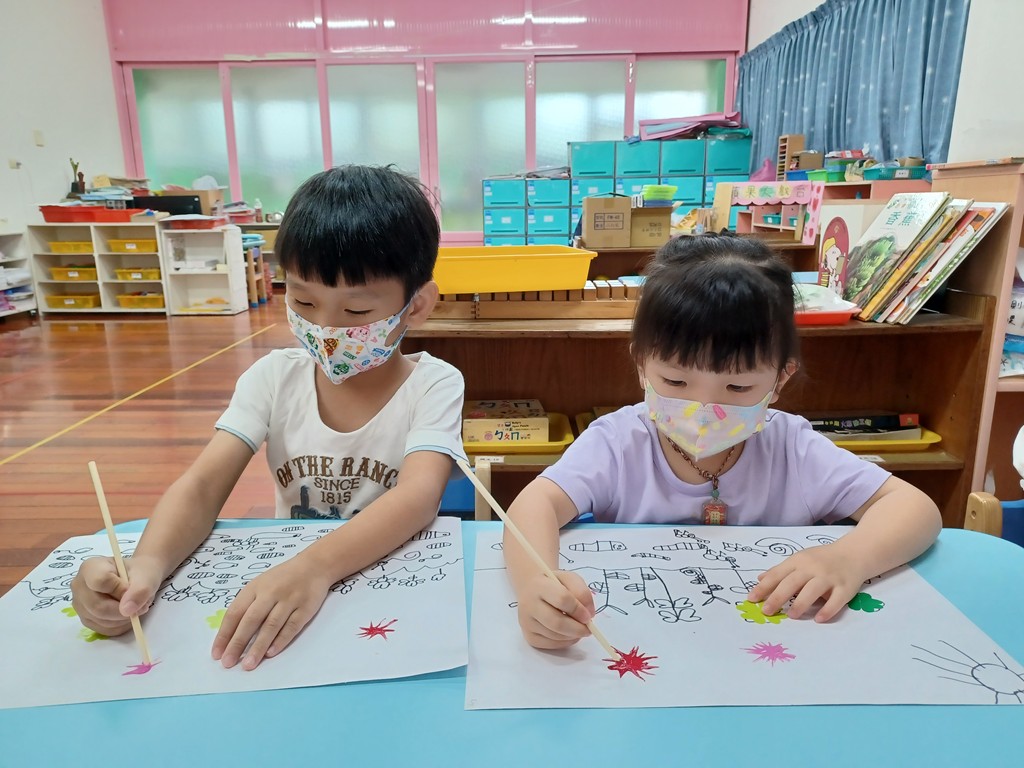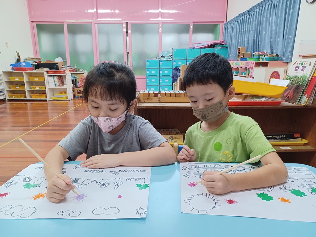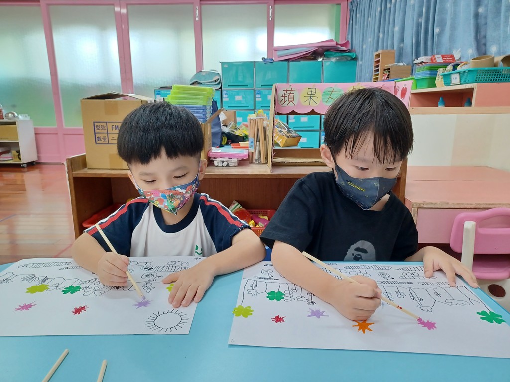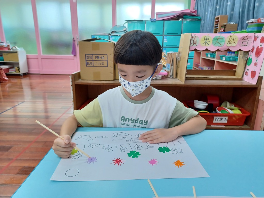 先畫出土壤和地底下的昆蟲,將小張色紙對折兩次,沿著愛心線條剪下來,打開變成4片葉子的〝幸運草〞,擠出一滴的廣告顏料,用竹筷子從中心往外刮開成花蕊狀,再畫出花瓣和莖葉,完成「美麗的花草園地」作品。