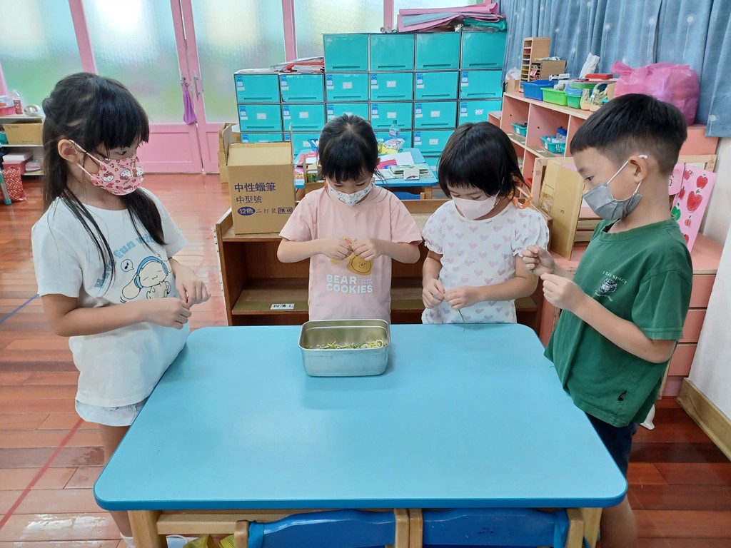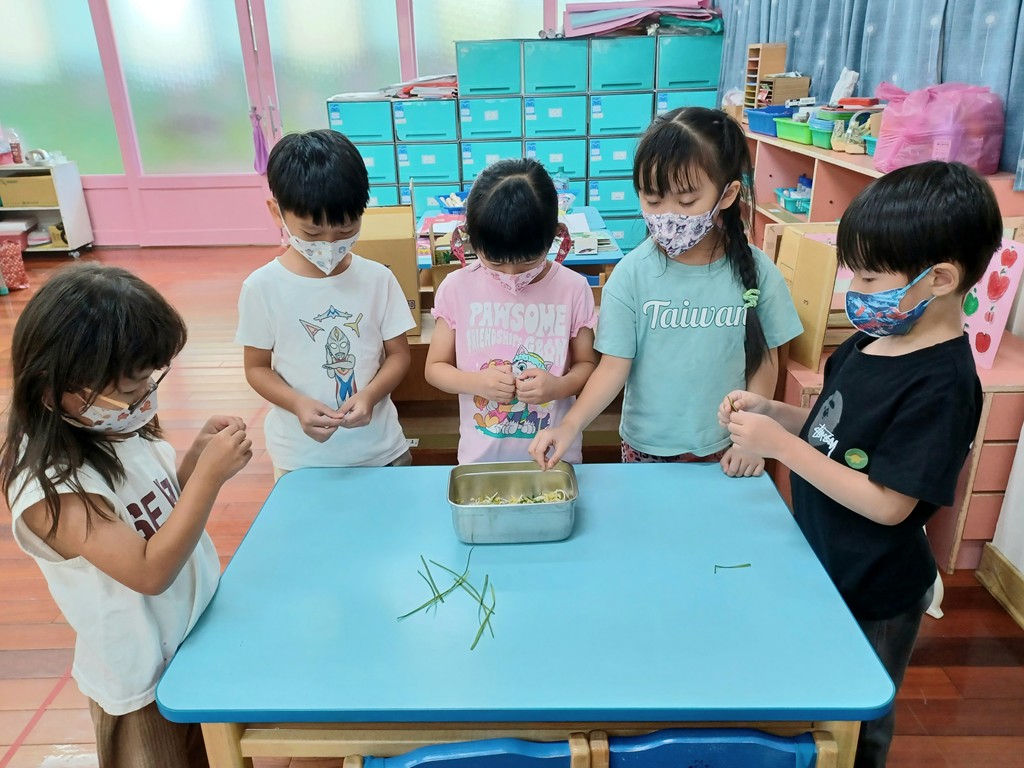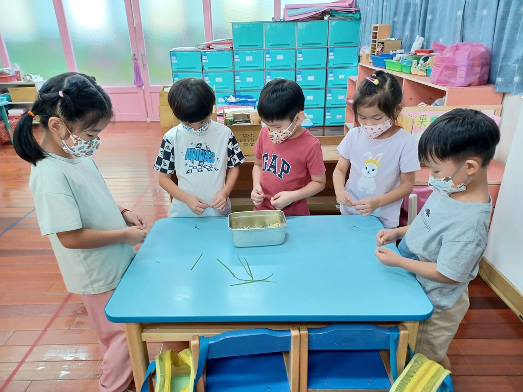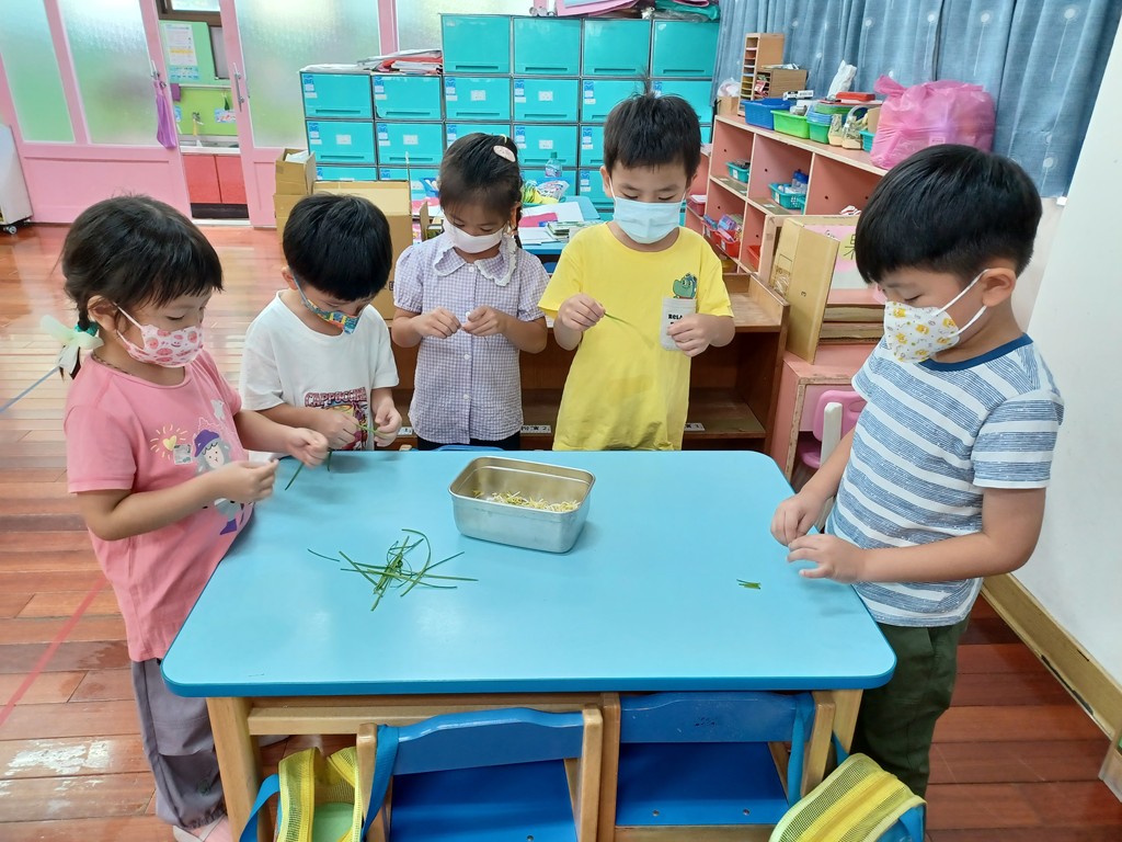 觀察子瑈帶來的燜豆芽菜與成長記錄圖後,討論如何煮?決定採收羽飛帶來盆栽裡的韭菜,和豆芽菜炒在一起吃。將每一根燜好的豆芽菜拔掉鬚鬚的根→採收韭菜→將韭菜剝成一段一段→拿到廚房炒熟→品嚐美味。