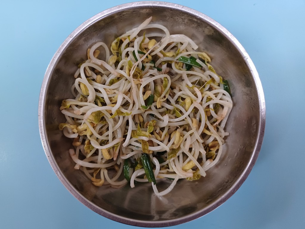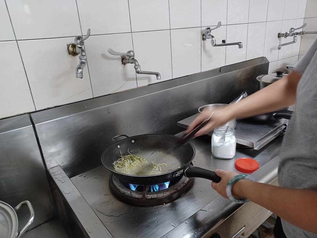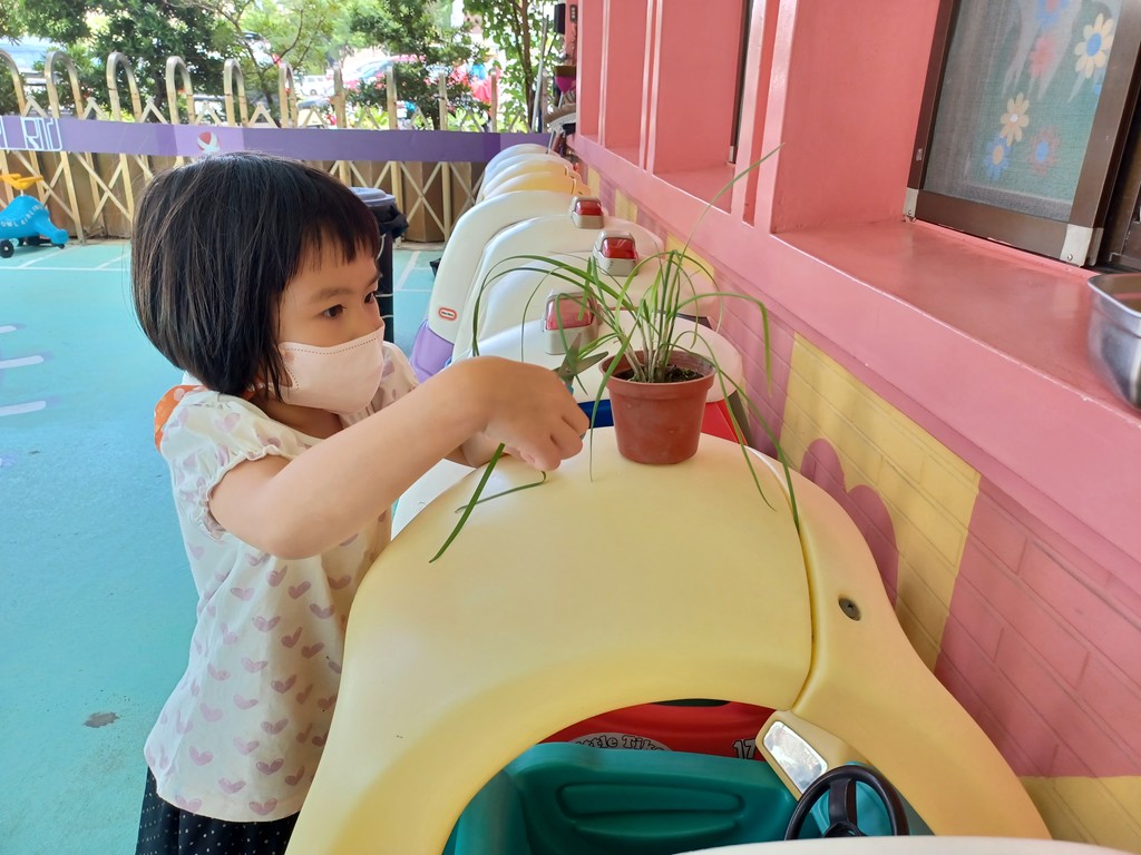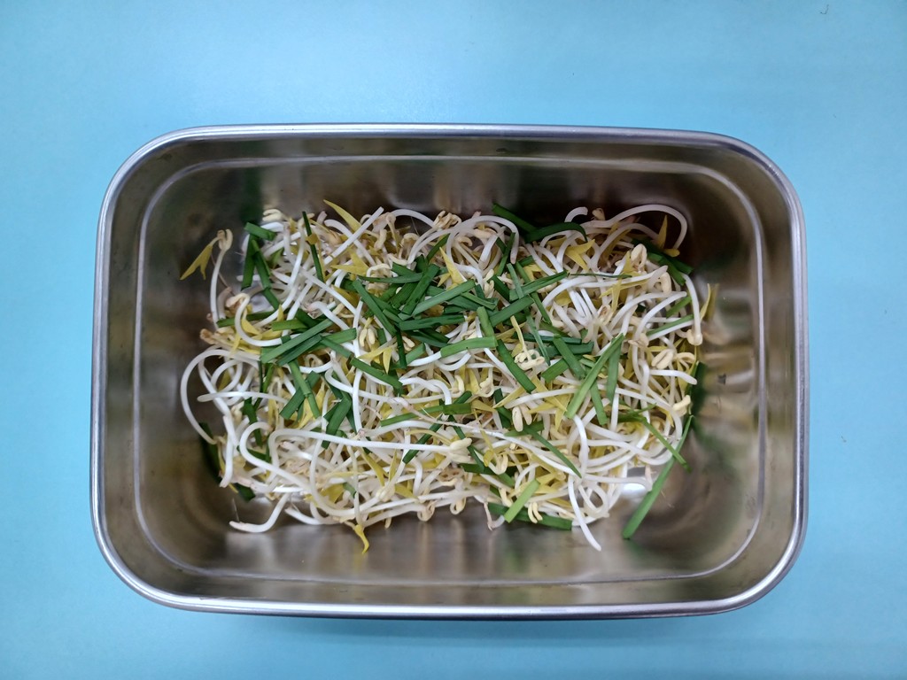 觀察子瑈帶來的燜豆芽菜與成長記錄圖後,討論如何煮?決定採收羽飛帶來盆栽裡的韭菜,和豆芽菜炒在一起吃。將每一根燜好的豆芽菜拔掉鬚鬚的根→採收韭菜→將韭菜剝成一段一段→拿到廚房炒熟→品嚐美味。