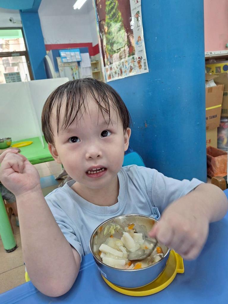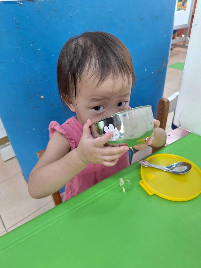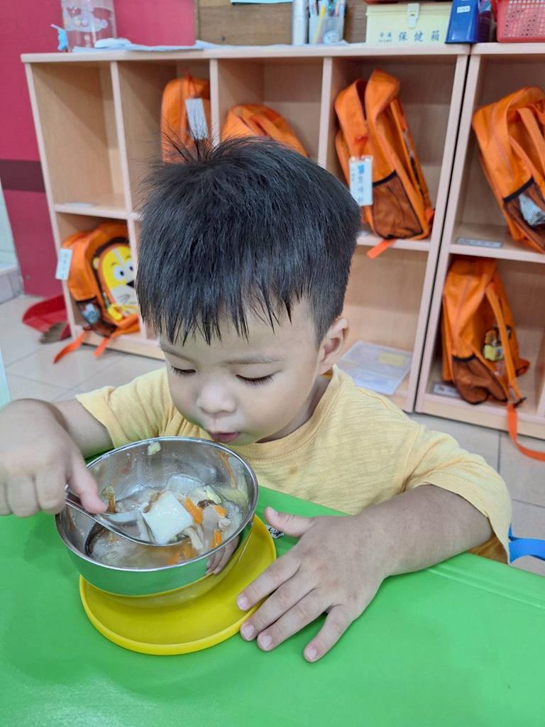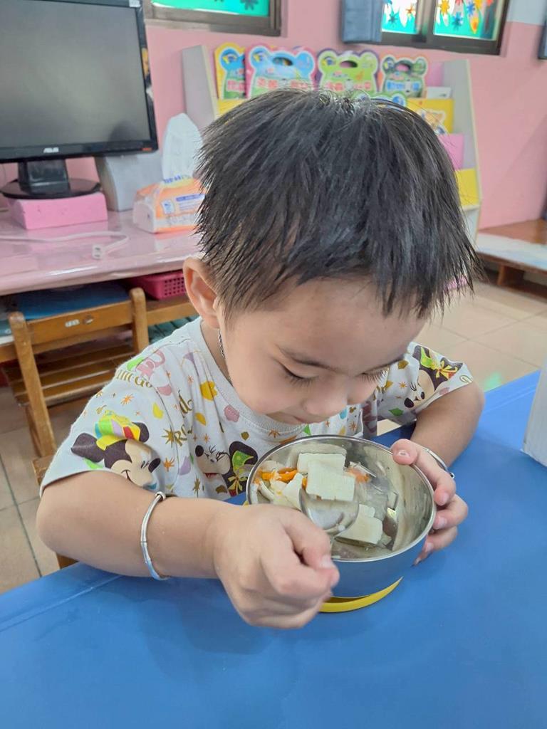 上學前我會看看自己衣服是否穿整齊,進教室前會自己穿鞋子及洗手,中午吃飯時手會扶著碗不讓衣服都是食物
