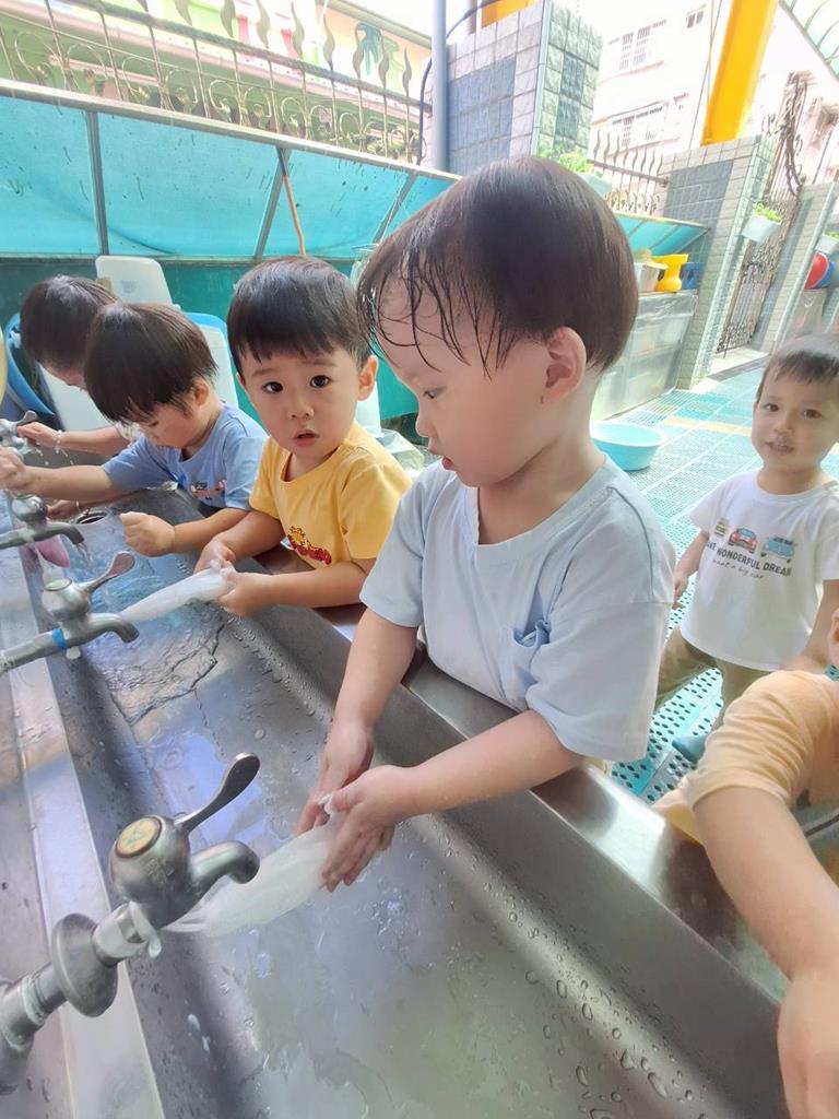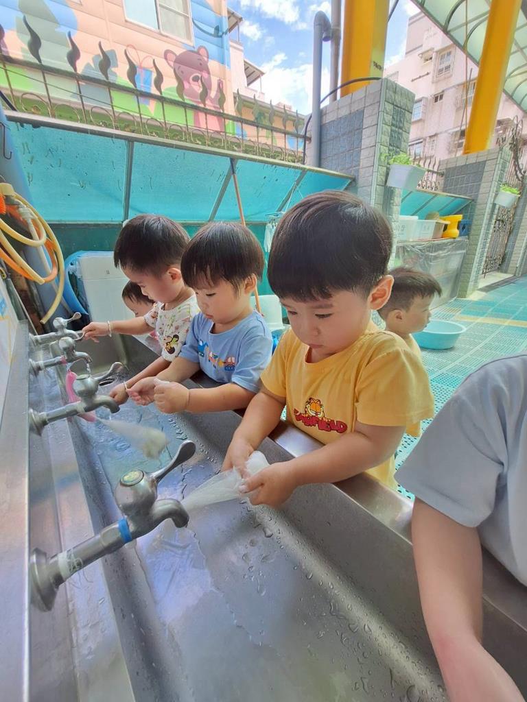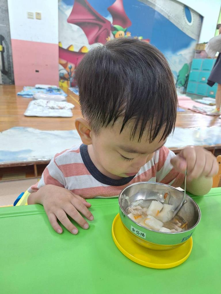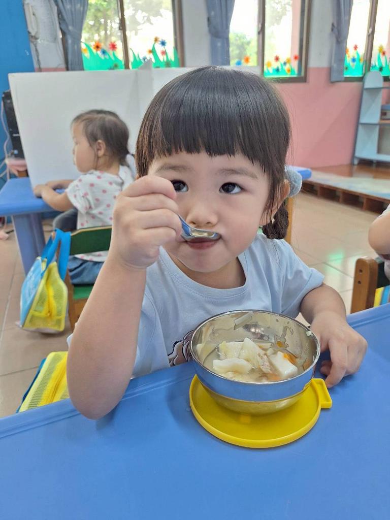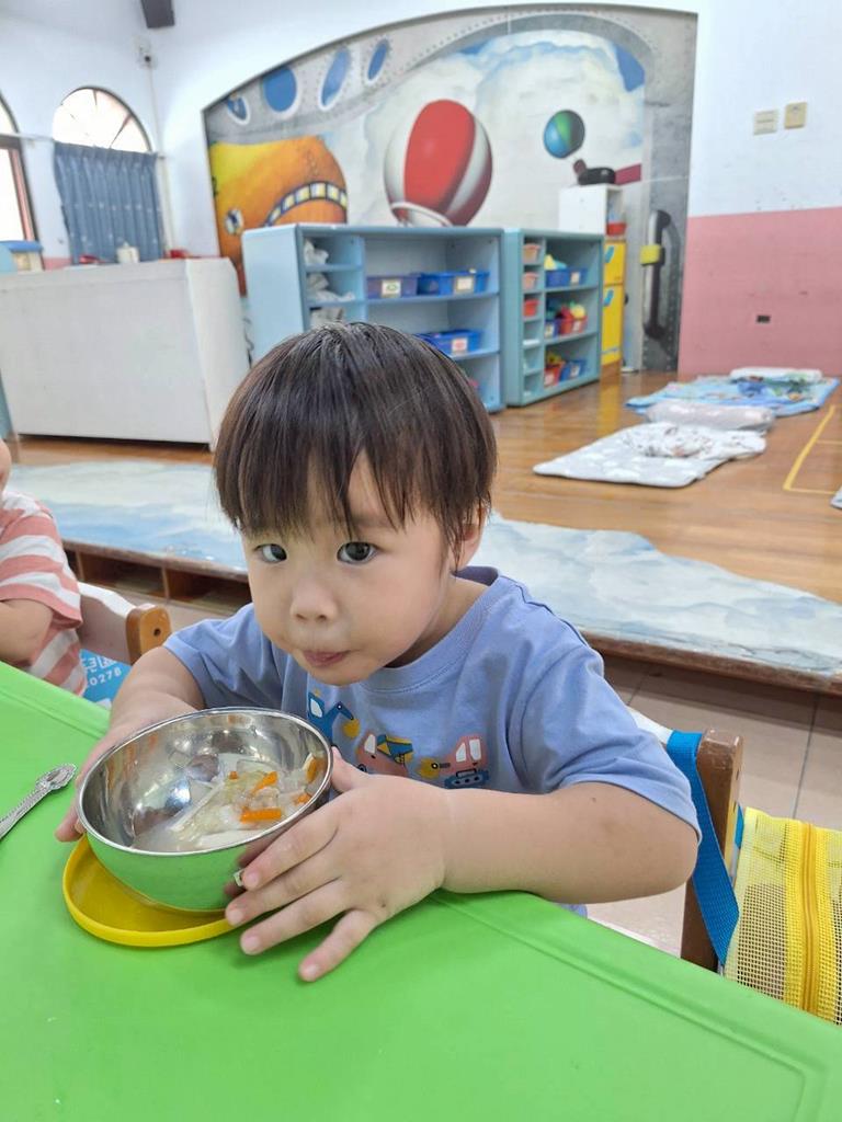 上學前我會看看自己衣服是否穿整齊,進教室前會自己穿鞋子及洗手,中午吃飯時手會扶著碗不讓衣服都是食物