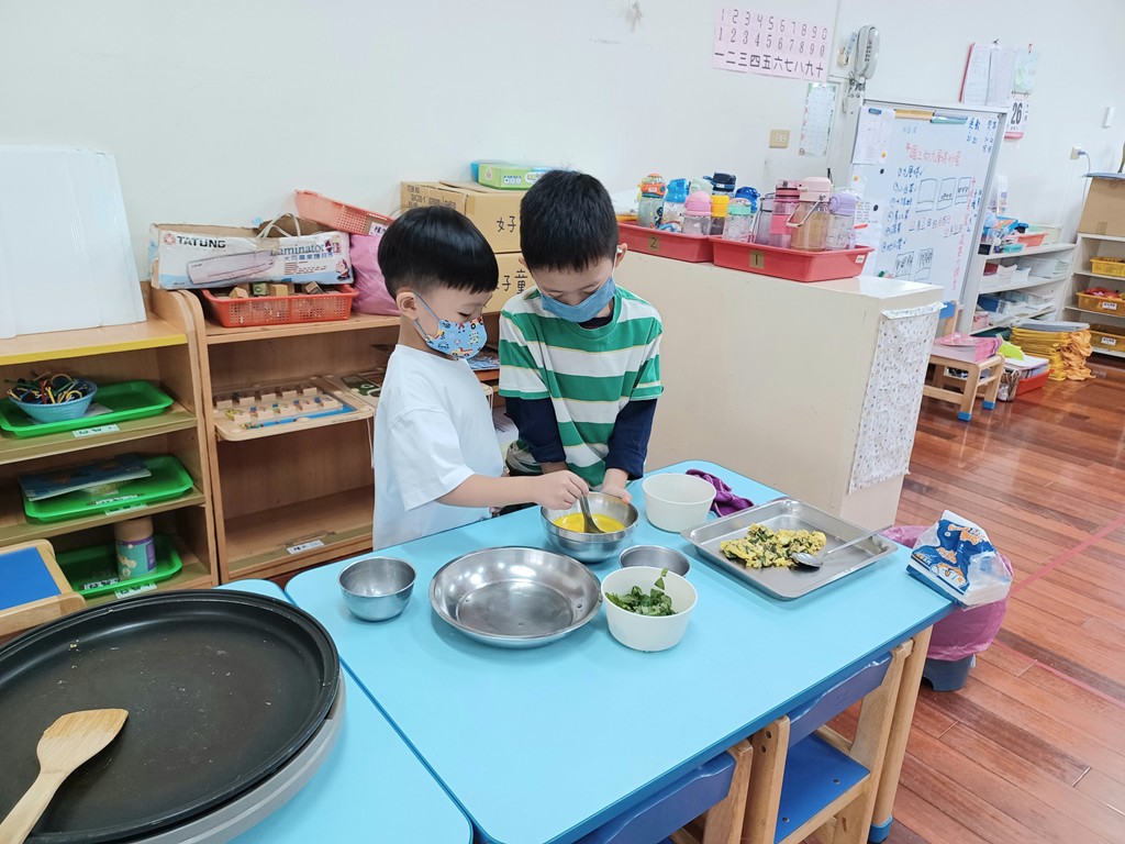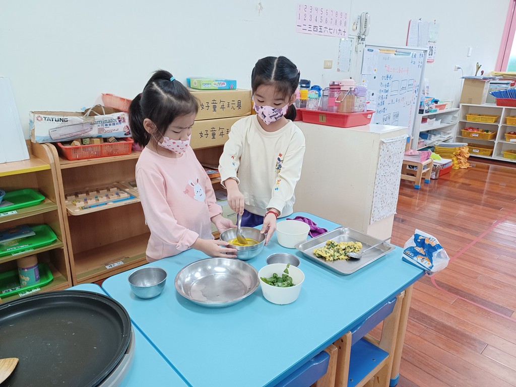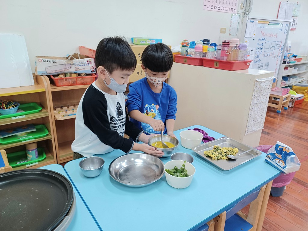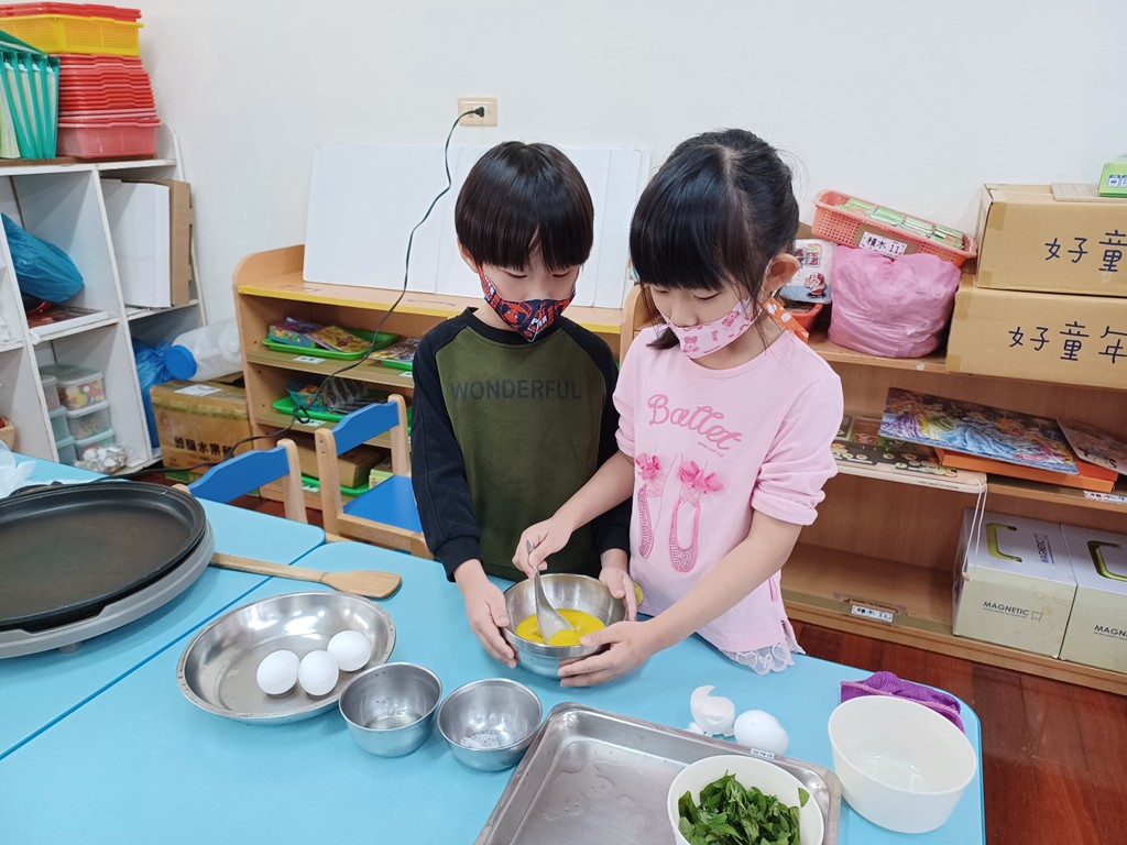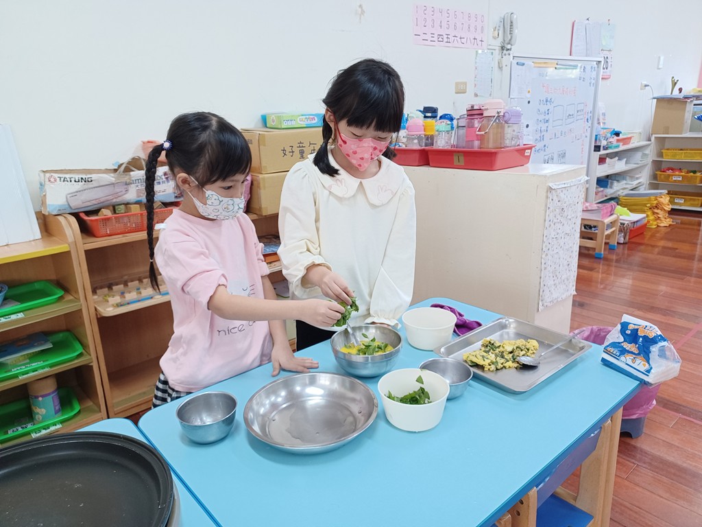 洗完九層塔和蛋後,開始攪拌蛋汁→加入九層塔→下鍋煎熟,煎好了,大家一起品嚐美味料理,香噴噴的滋味,好吃極了!