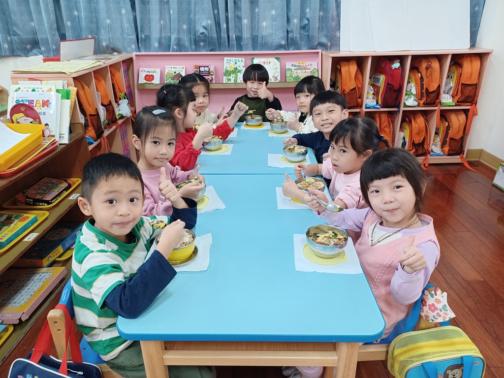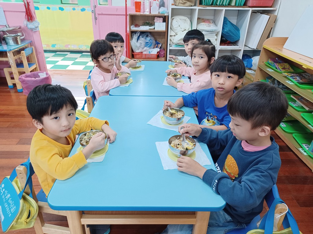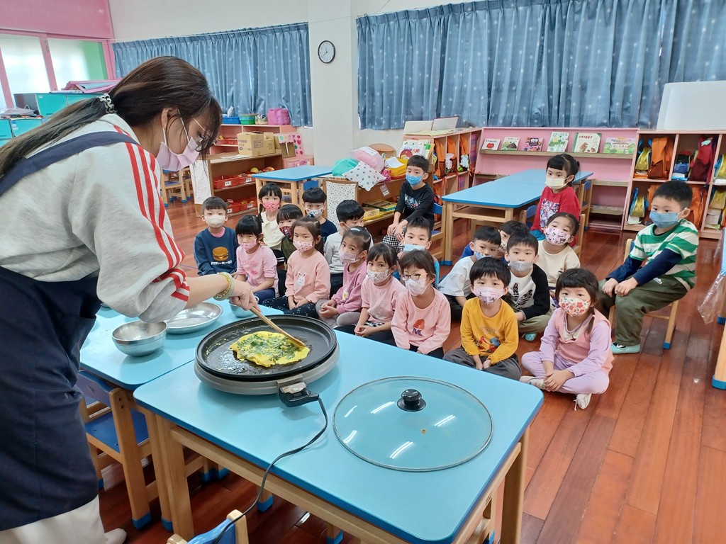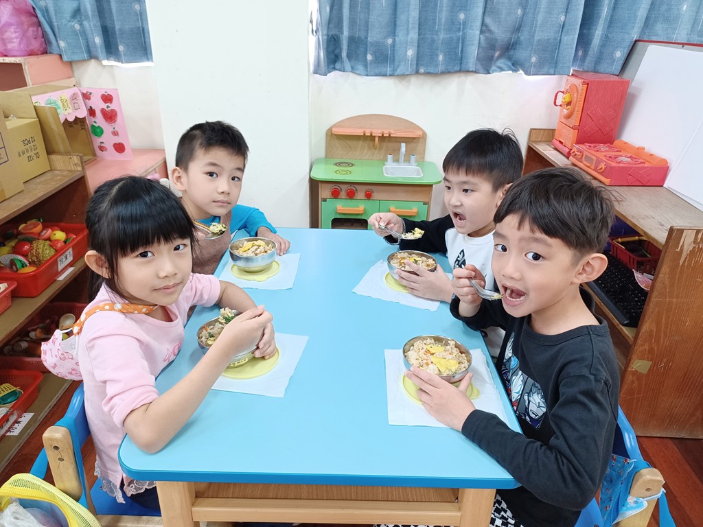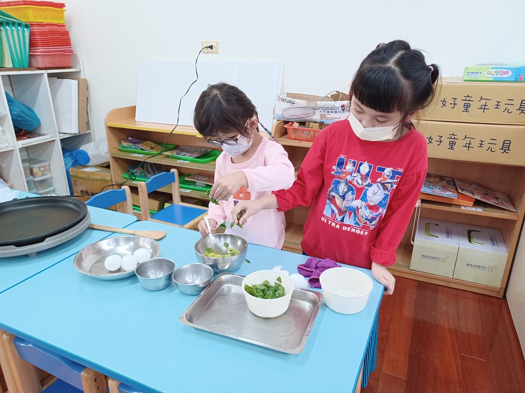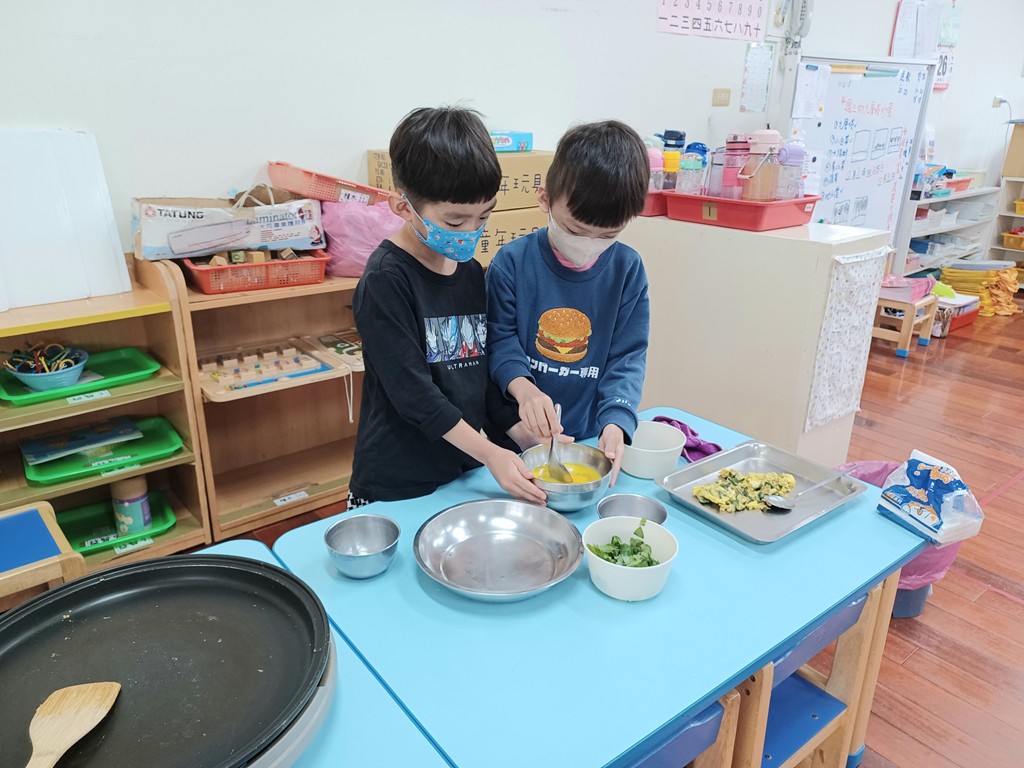 洗完九層塔和蛋後,開始攪拌蛋汁→加入九層塔→下鍋煎熟,煎好了,大家一起品嚐美味料理,香噴噴的滋味,好吃極了!
