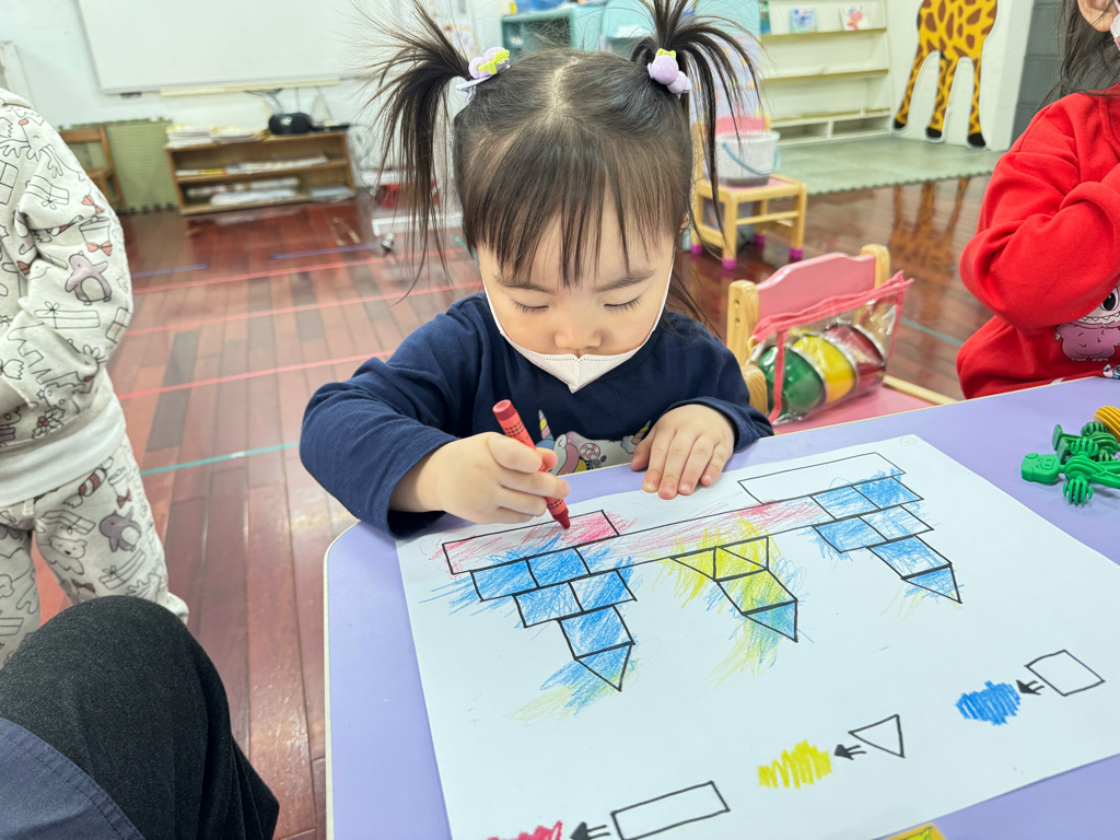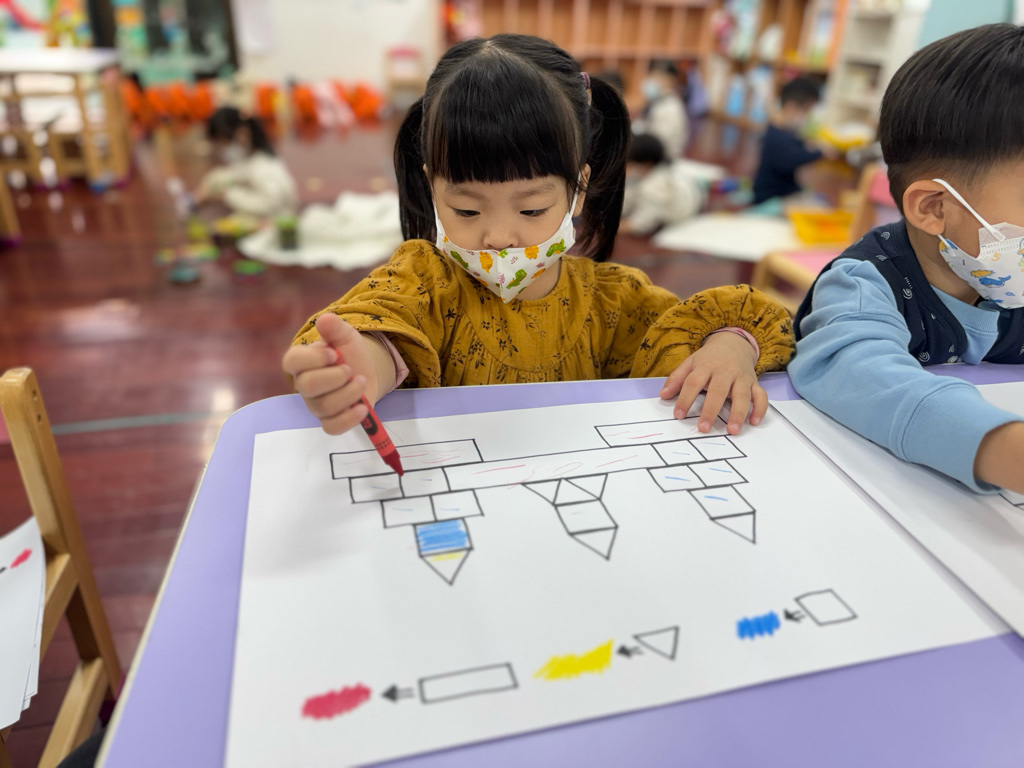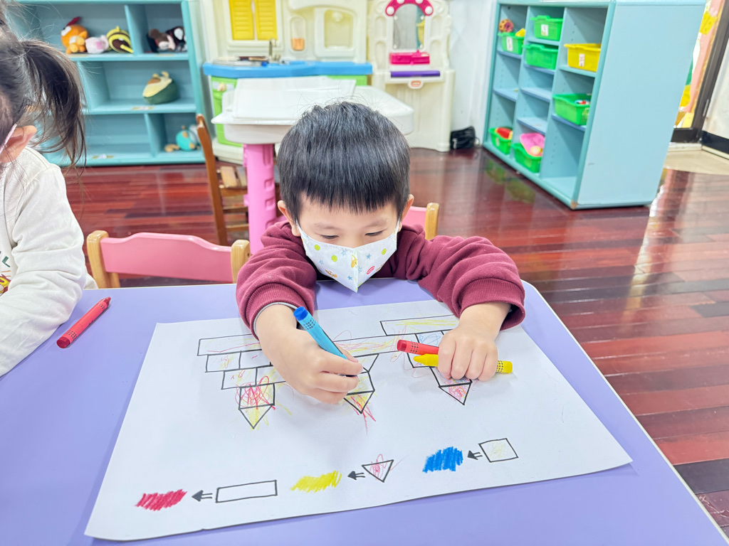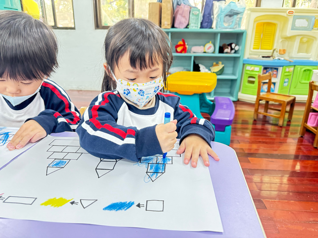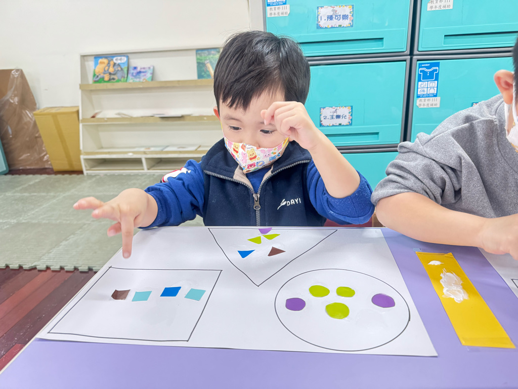 搭配課程的教學,認識了顏色、形狀,延伸到創作上,將相同的的對應,塗上顏色以及貼上對應的形狀⭕️🔺🔲
