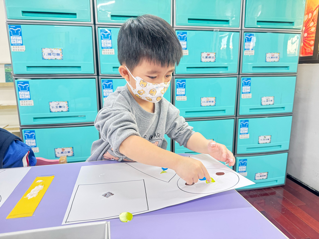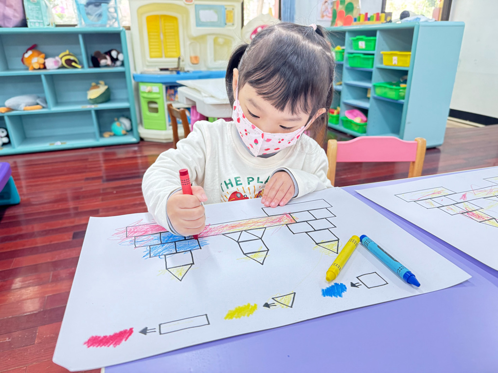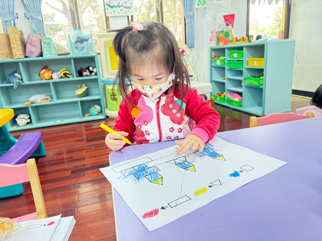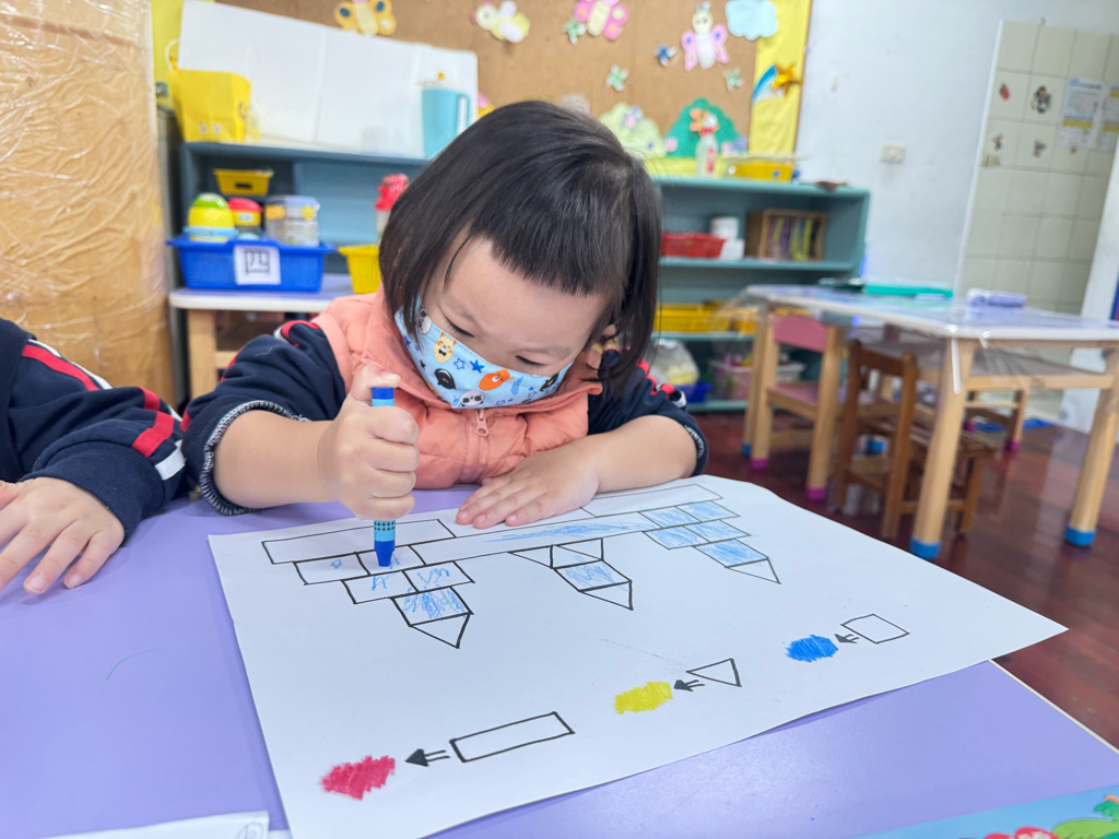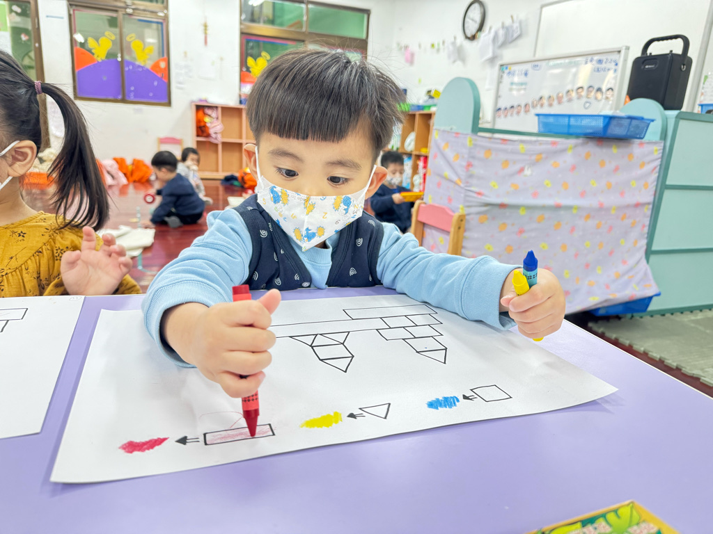 搭配課程的教學,認識了顏色、形狀,延伸到創作上,將相同的的對應,塗上顏色以及貼上對應的形狀⭕️🔺🔲