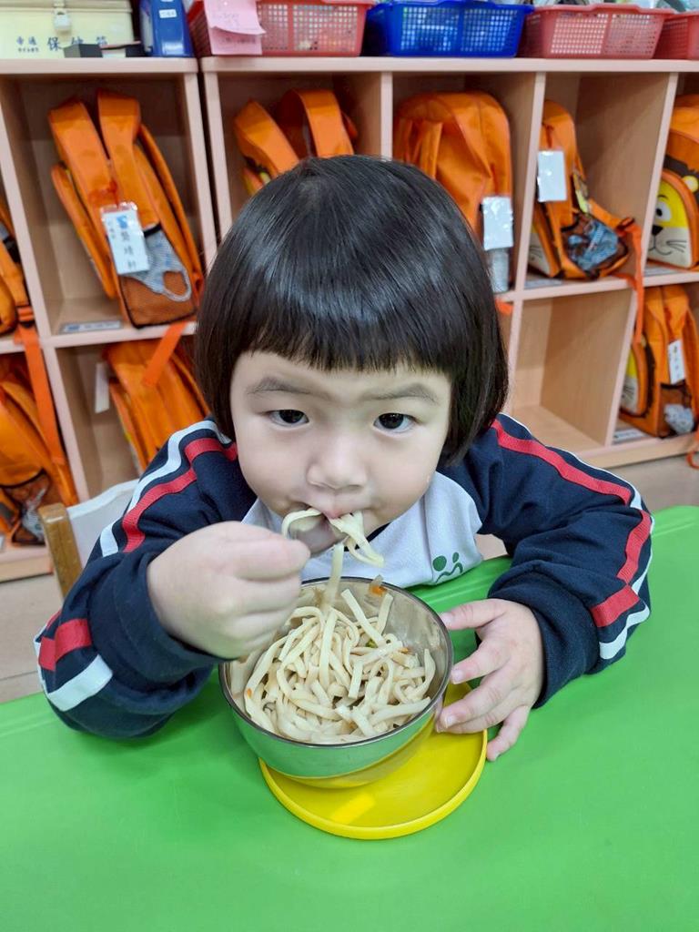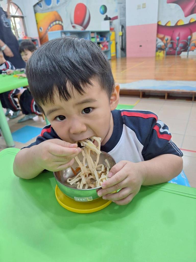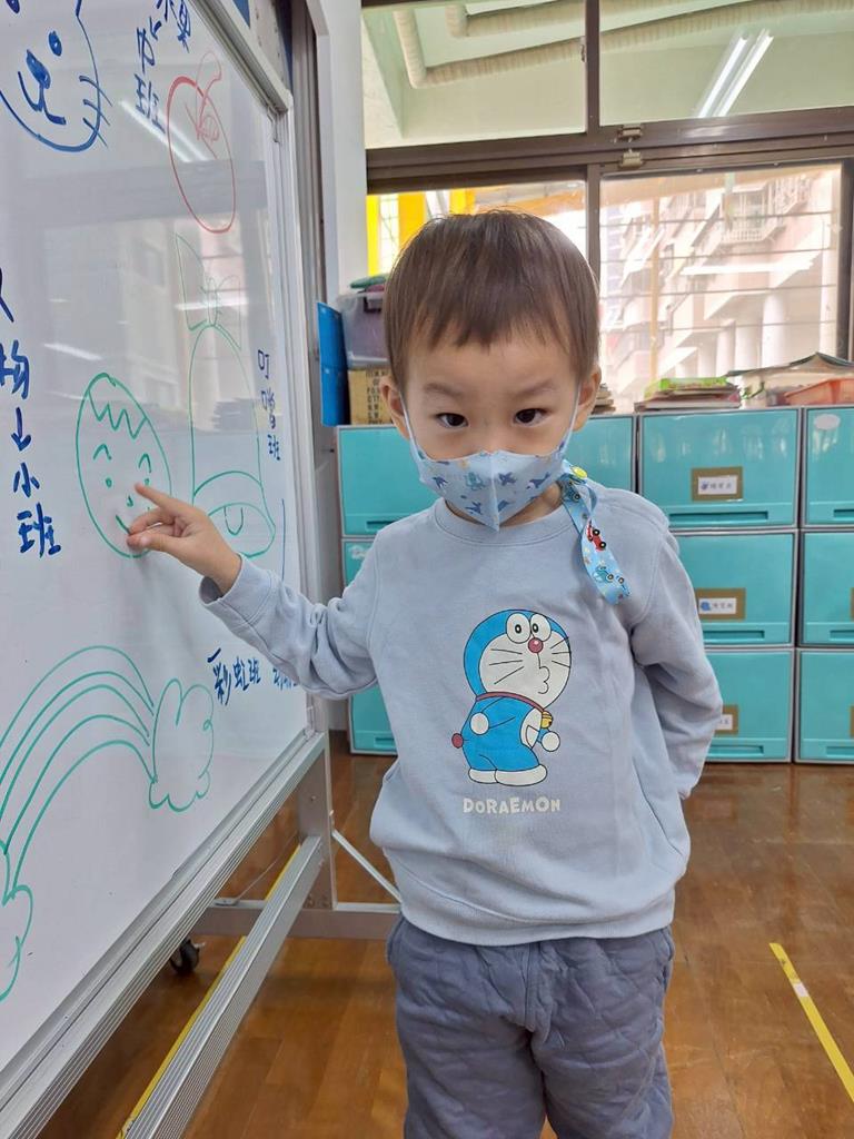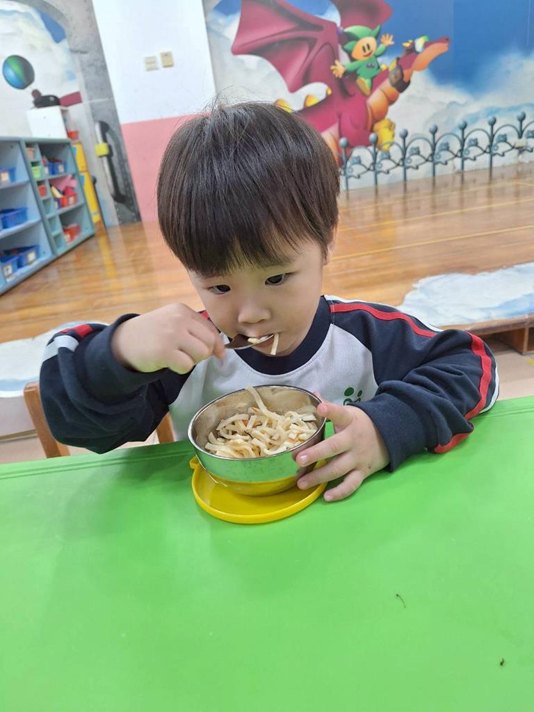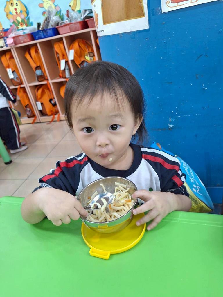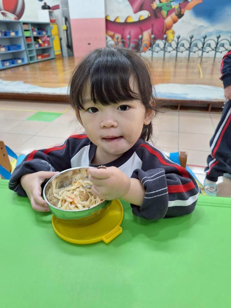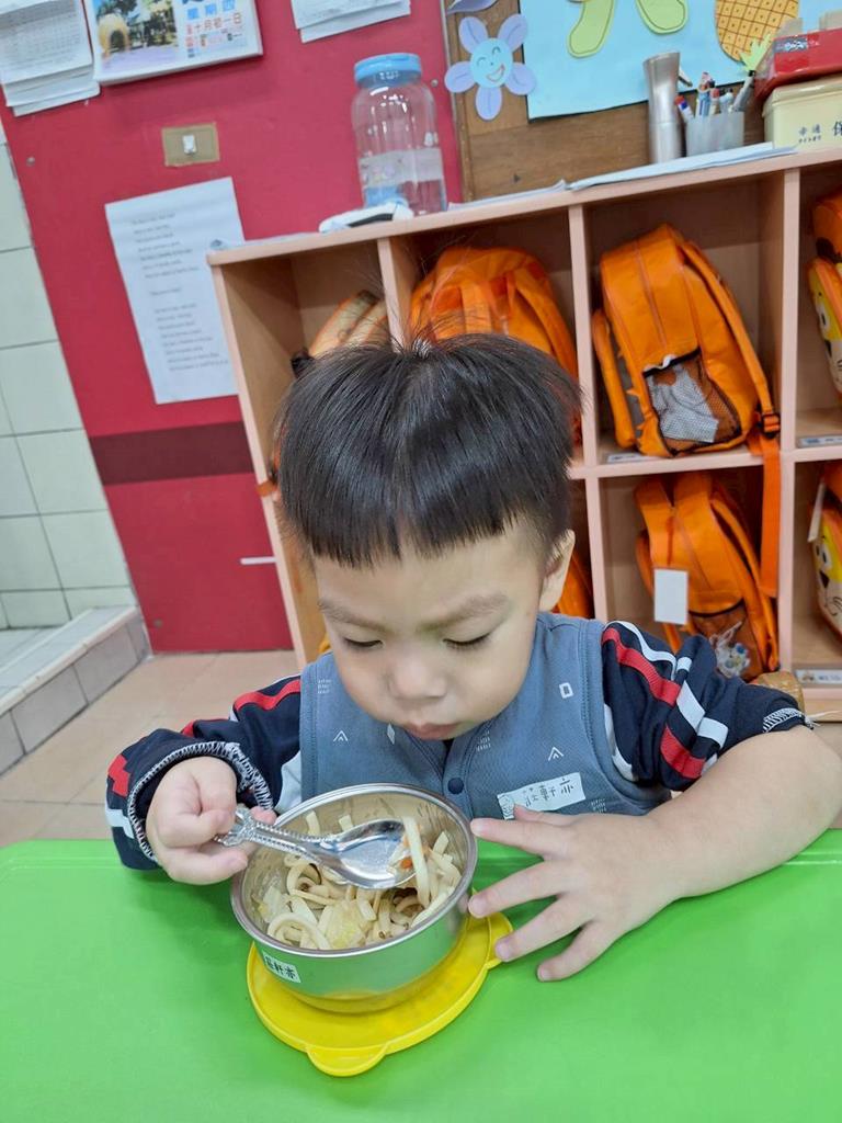 帶孩子觀察每個班級的圖案,並認識叮噹是甚麼圖案,也讓孩子幫叮噹的圖,塗上漂亮的顏色,老師在教孩子如何正確的用餐禮儀,椅子會做好,手會扶著碗嘴巴靠近碗,吃完會拿衛生紙先擦嘴巴再把碗擦乾淨,再將碗收進餐袋