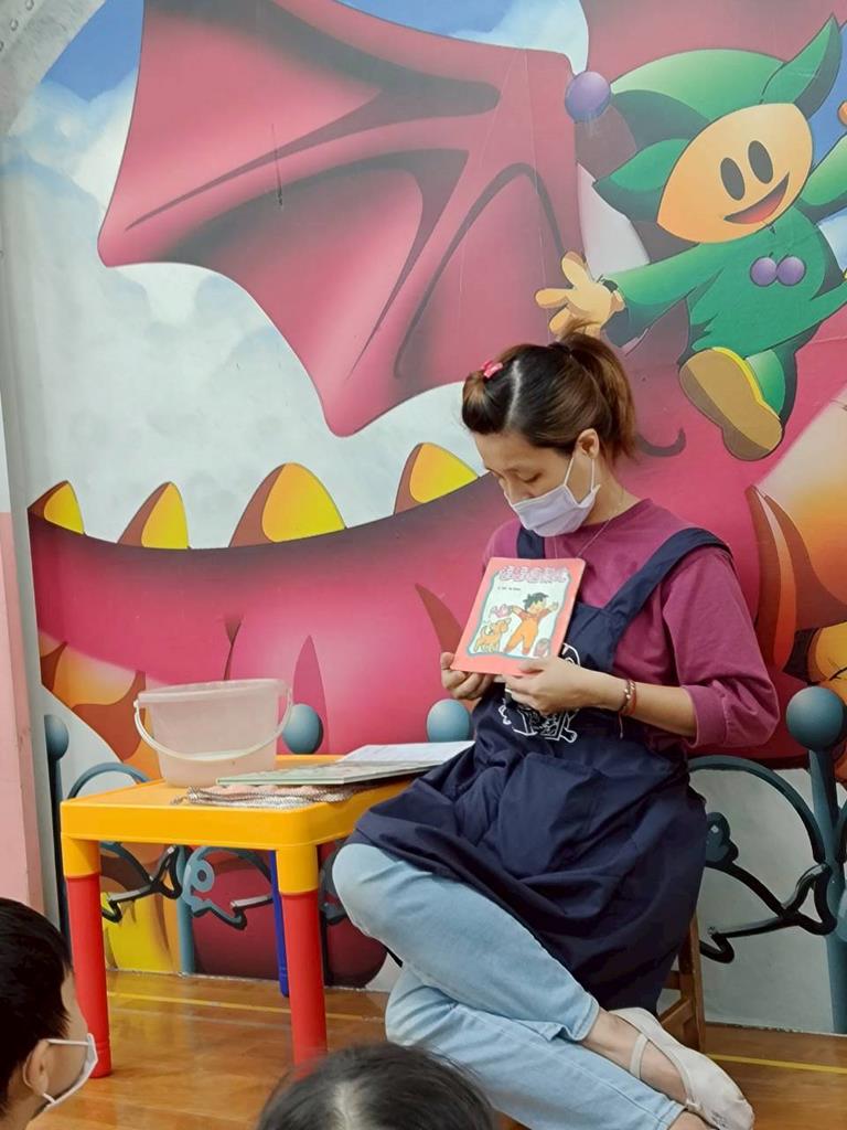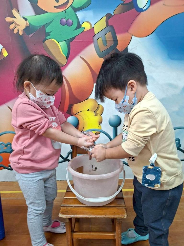老師分享完繪本後,教孩子如何是用抹布擦桌子椅子,用餐完會拿抹布把桌子擦乾淨,如桌子有飯粒會撿起來拿去垃圾桶丟