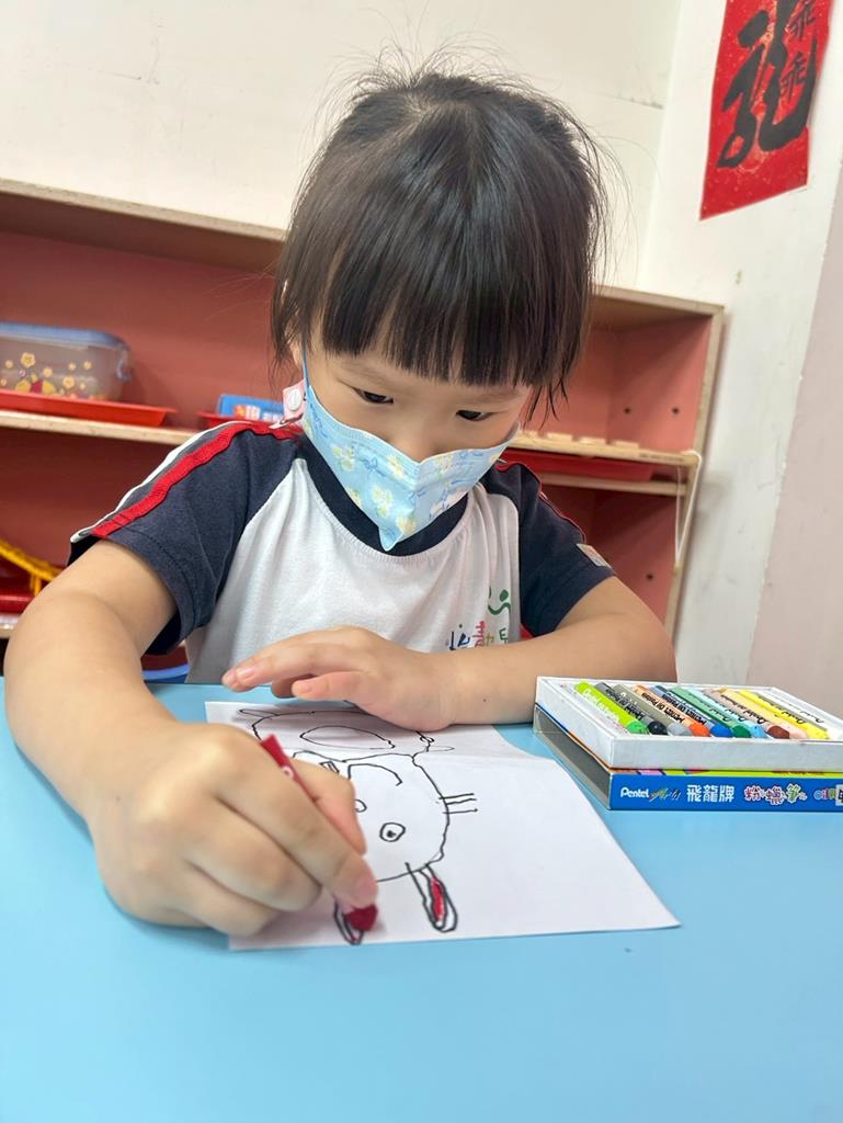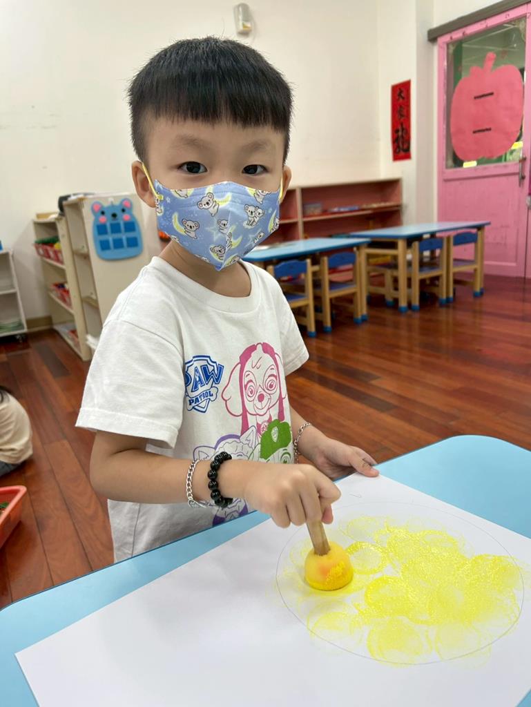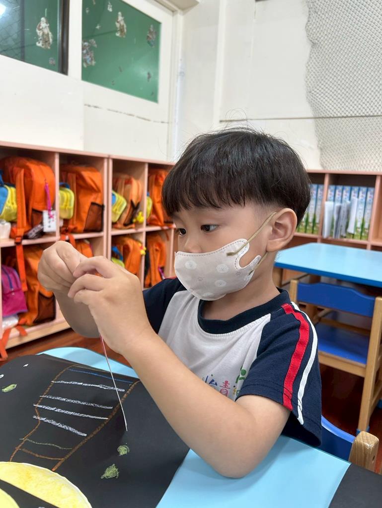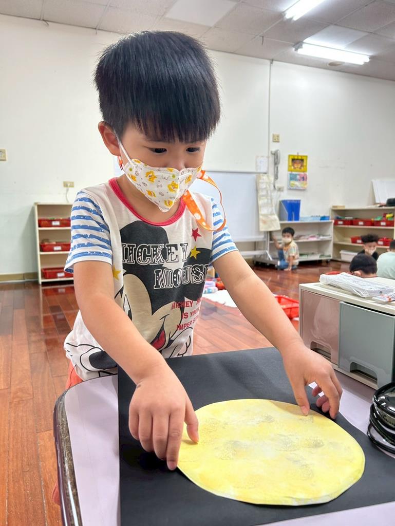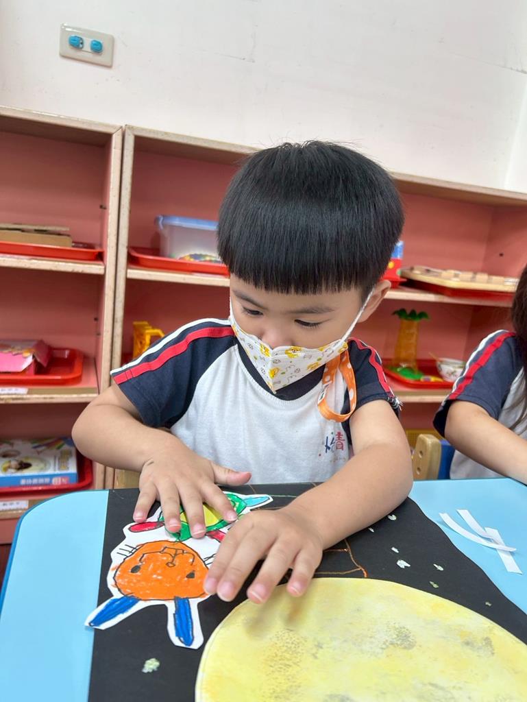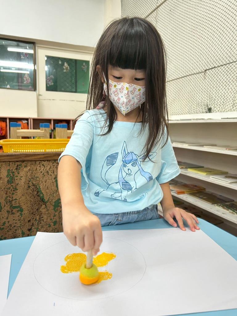 用三個顏色蓋印出月亮模樣,跟著老師步驟畫出兔子和樓梯,組合再一起就完成囉!