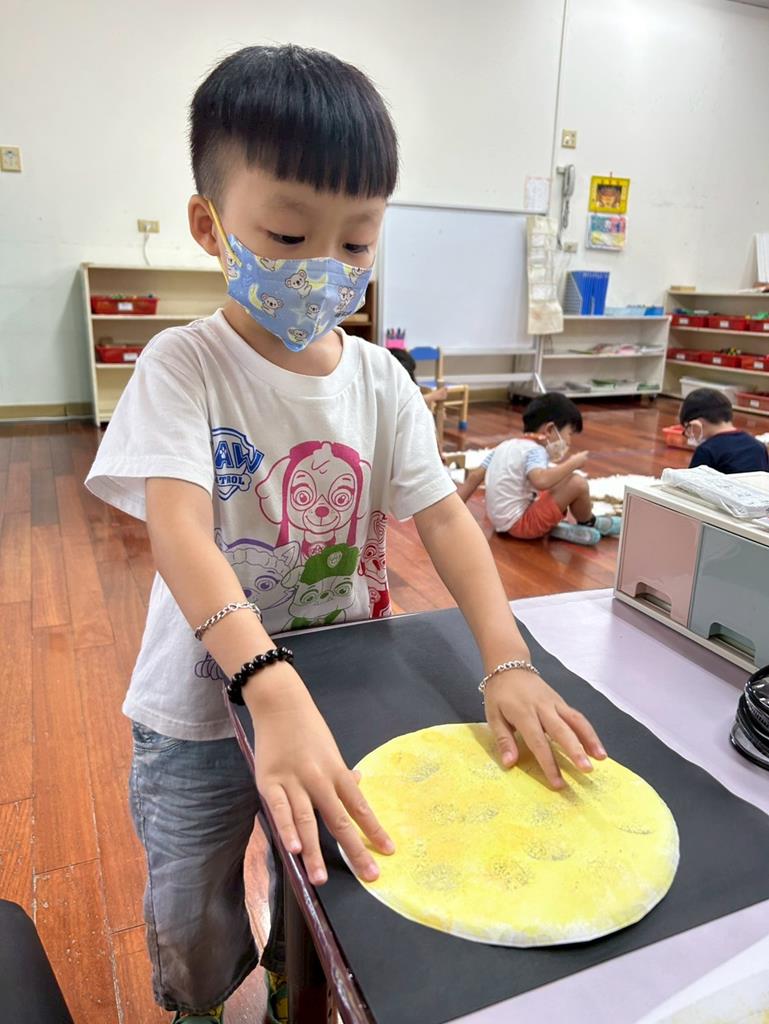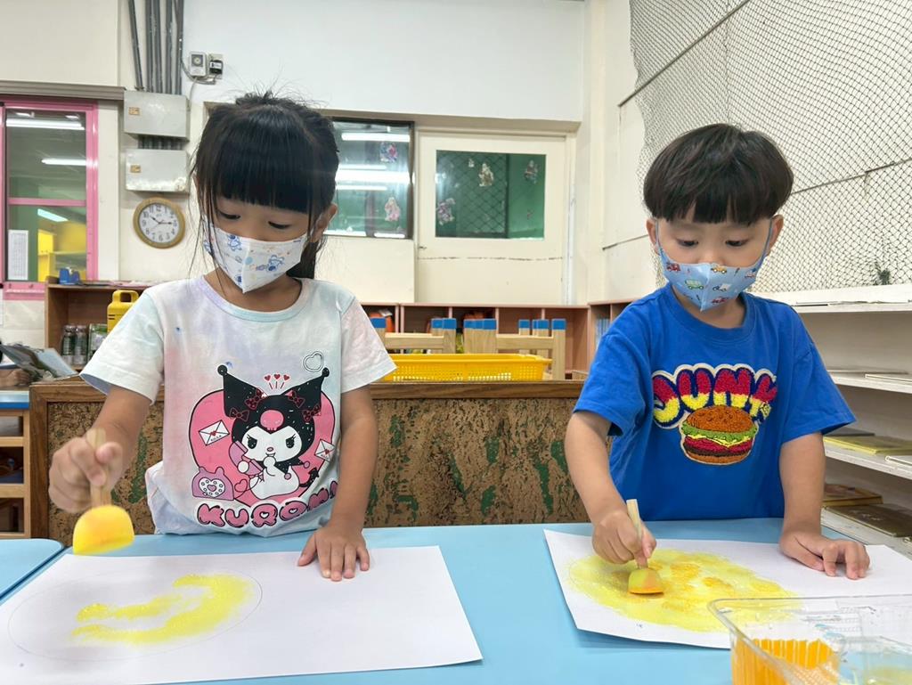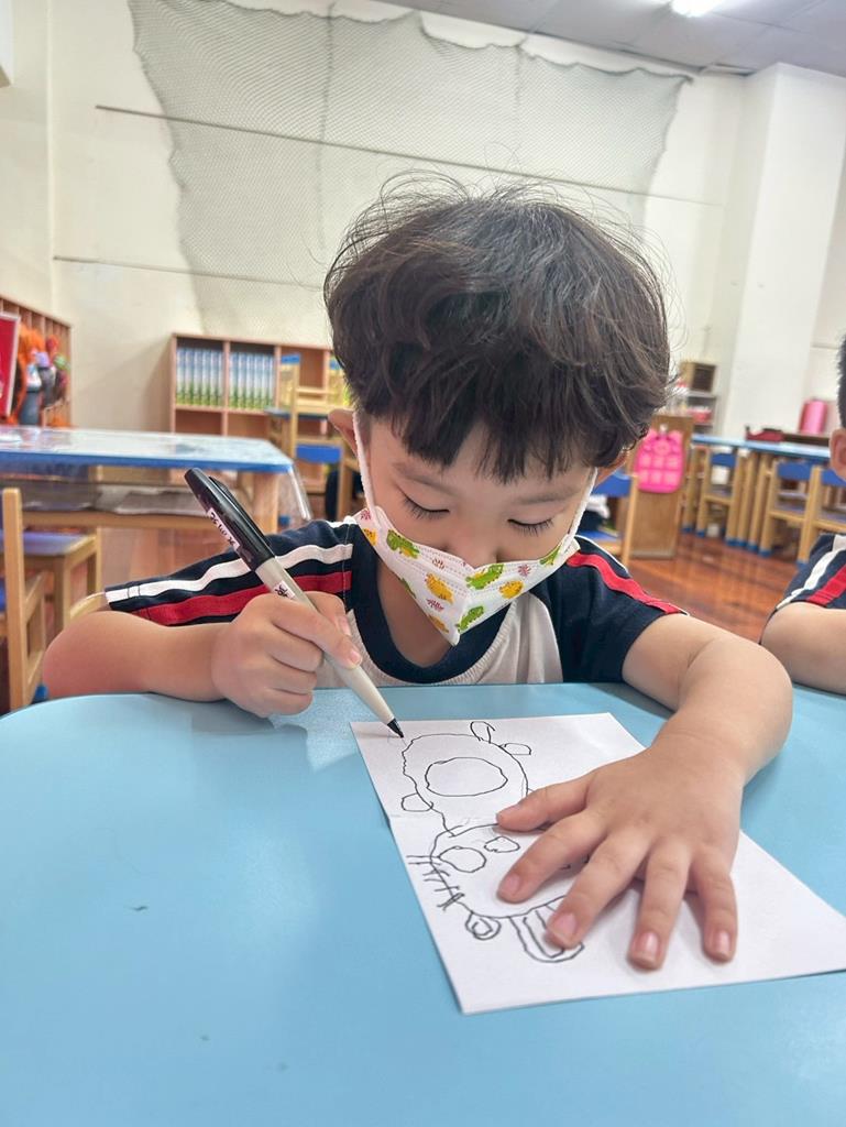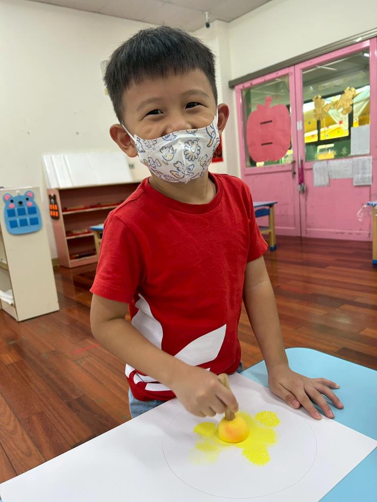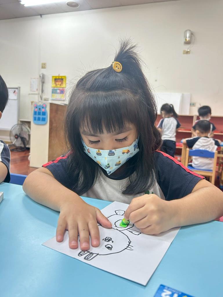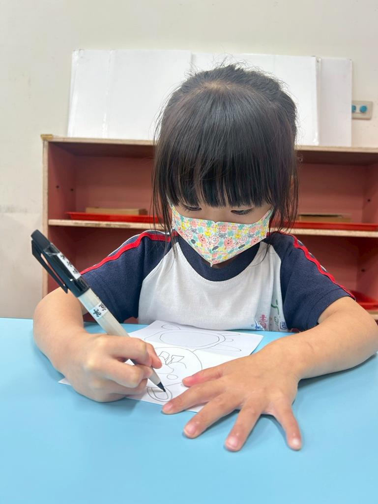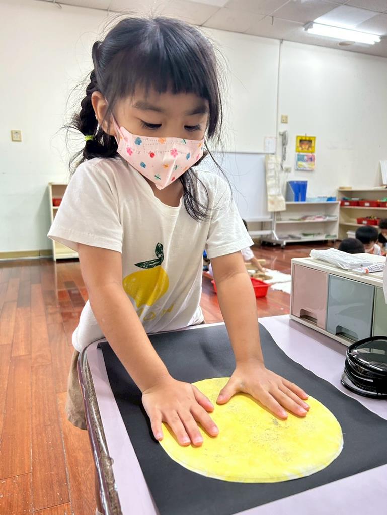 用三個顏色蓋印出月亮模樣,跟著老師步驟畫出兔子和樓梯,組合再一起就完成囉!