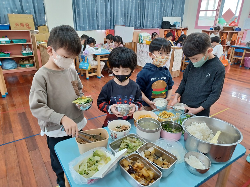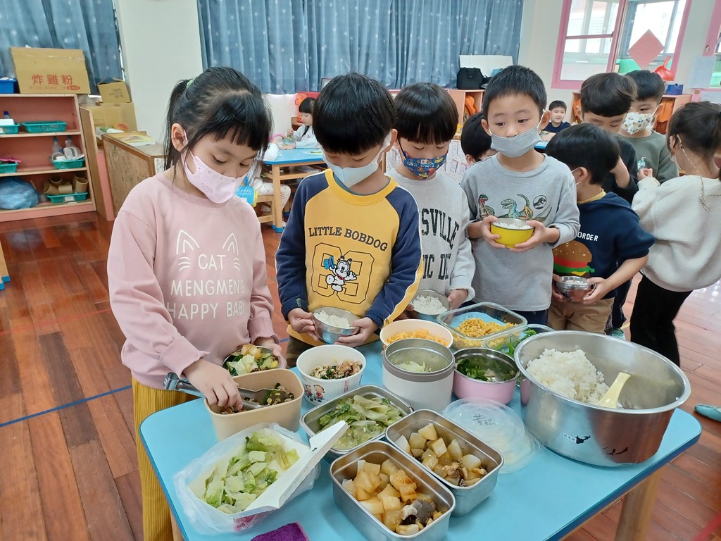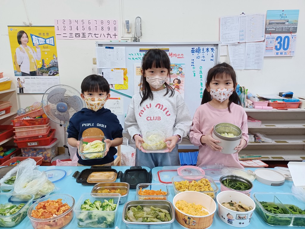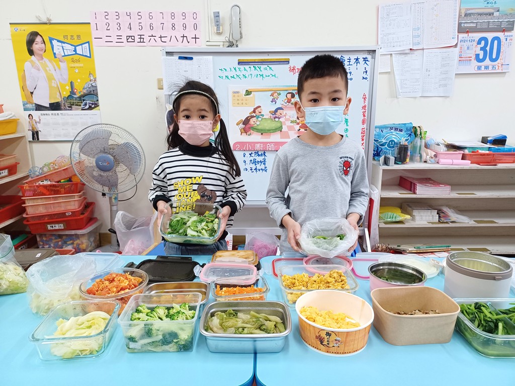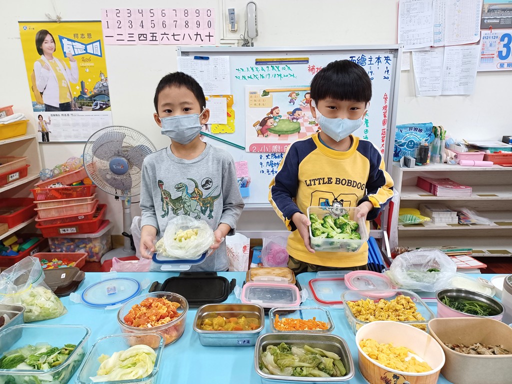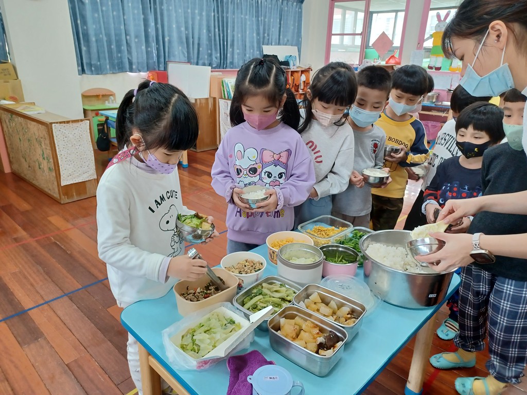 主題進行至尾聲,孩子想要品嚐〝蔬菜大餐〞,於是討論後,每人從家裡帶一道蔬菜料理來一起享用。希望透過活動的進行,讓孩子願意品嚐各種蔬菜的口感與味道,進而愛上吃蔬菜,知道食物得來不易。