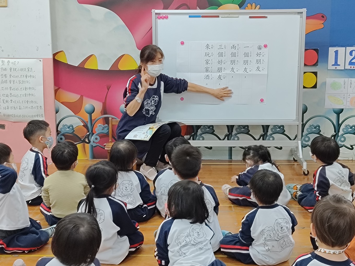 老師運用繪本引起動機,引導孩子認識好朋友要學習如何相處,互相幫忙及懂得分享,而在接受別人幫忙時,也要懂得互相道謝。